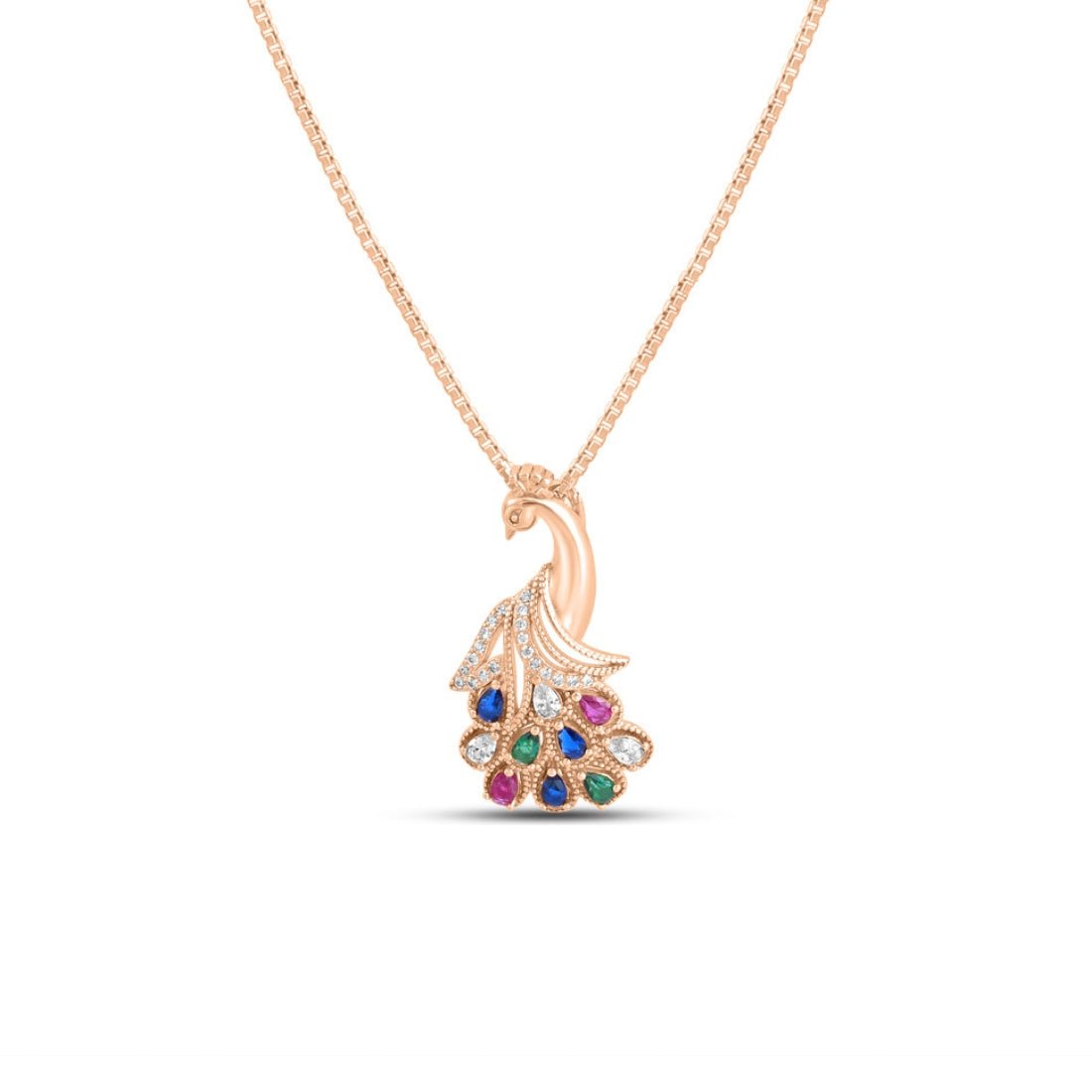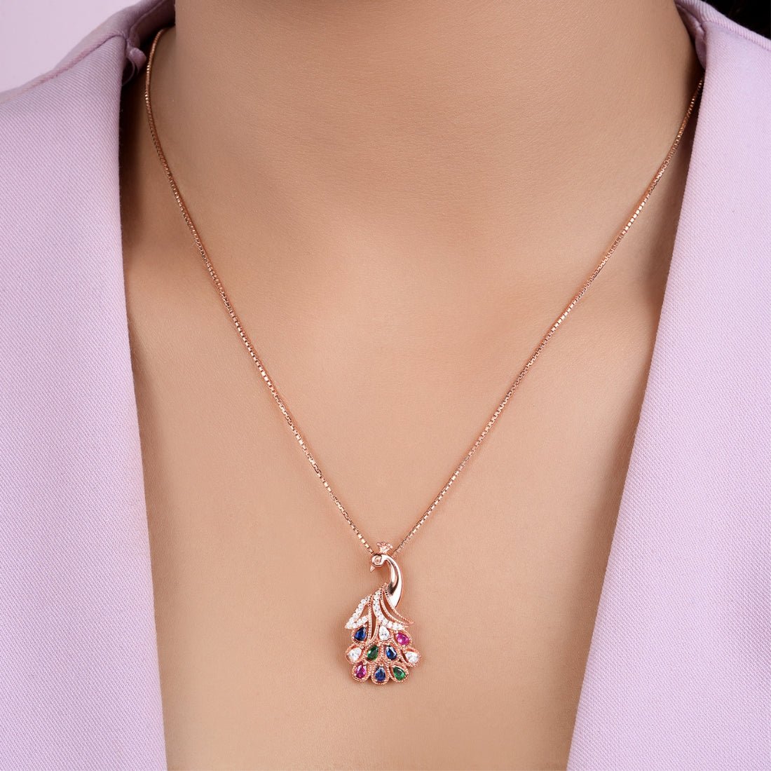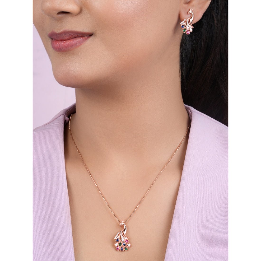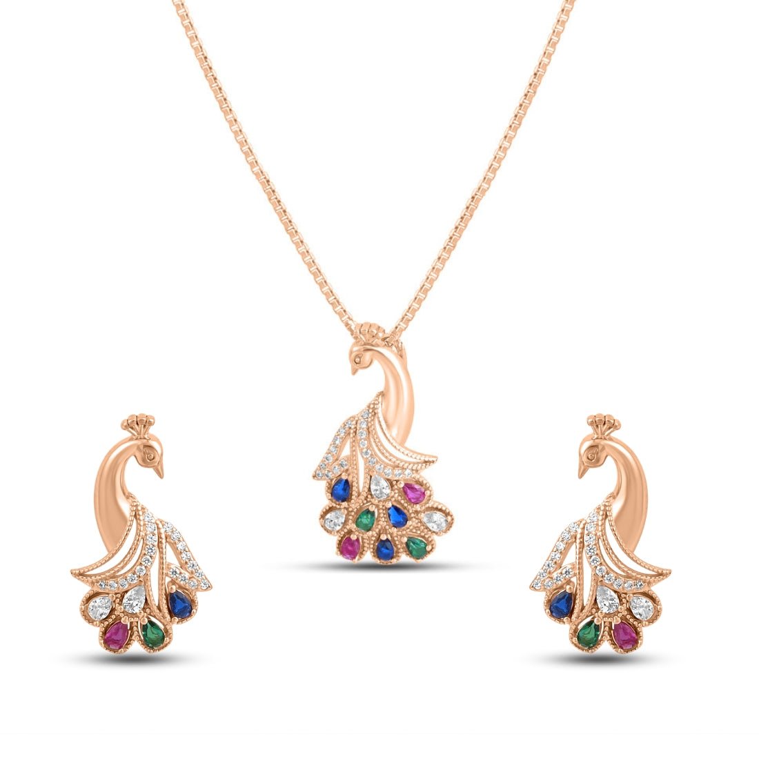 Product Description:- Crafted from high-quality sterling silver and adorned with a radiant rose gold plating, this jewellery set features intricate peacock-inspired designs that evoke a sense of beauty and grace. The set includes a matching necklace and earrings each embellished with sparkling cubic zirconia stones that add a touch of luxury and brilliance.